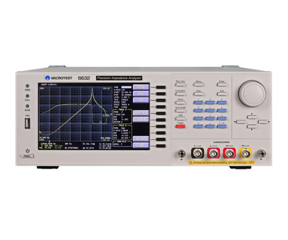6632 精密阻抗分析儀,提供 6 種頻率選項(10 Hz 至1/3/5/10/20/30 MHz),可以進(jìn)行交流信號的LCR測試,測試頻率和測試級別可進(jìn)行連續(xù)變化的階段測量??稍诓煌瑴y試、模式條件下、進(jìn)行高速地連續(xù)測試。提供輸出阻抗25?/100?可切換,ALC補償,多步測試;BIN 分類及比較器功能在自動元件生產(chǎn)時進(jìn)行良品與不良品分類。內(nèi)建直流偏置電壓±12V,并可選購?fù)鈷熘绷髌秒妷?電流 0到±40V/±100mA,精準(zhǔn)量測壓電陶瓷材料之導(dǎo)納圓繪圖,提供量測電容之直流電壓特性;及選購等效電路分析功能支援7種不同的參數(shù)模型(三元件、四元件),可協(xié)助客戶模擬元件的等效參數(shù)值??纱钆?6210, 6220,或6240直流偏流源測試系統(tǒng)。且支援RS-232、GPIB、Handler、LAN、USB Host/Device 等介面。